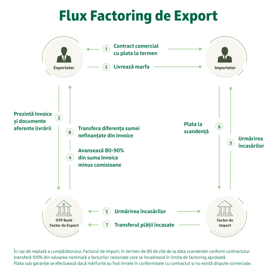 Export Factoring is an innovative and advantageous product, which provides financing of receivables generated from export operations with payment on term. In other words, OTP Bank, in partnership with an Import Factor in the Importer's country, buys the invoices, collects them on due date and covers the risk of non-payment, and you turn your own receivables into active working capital.